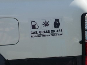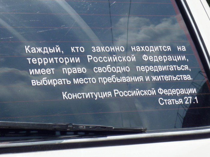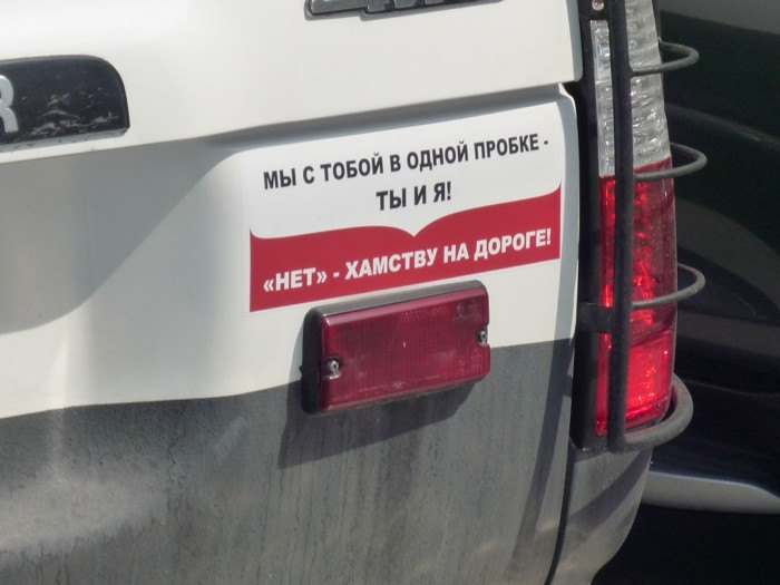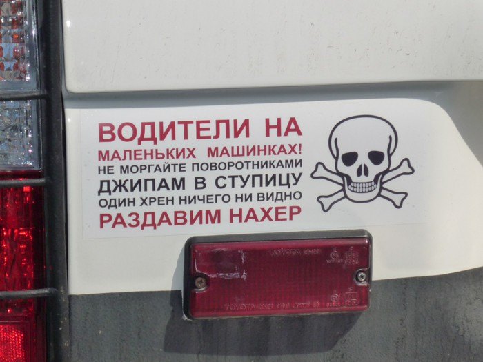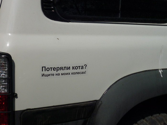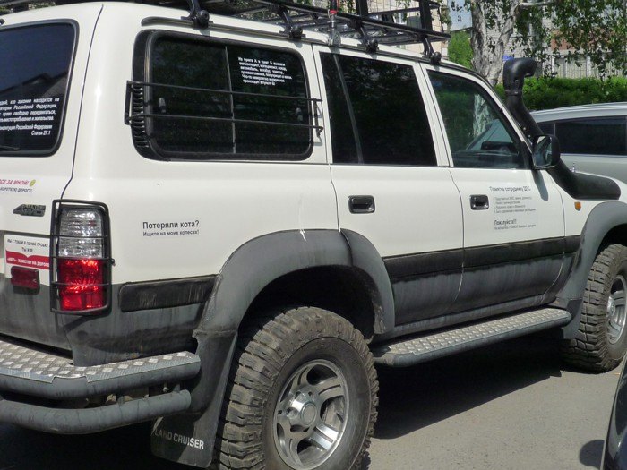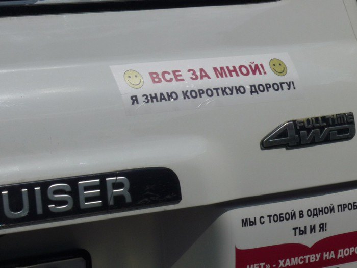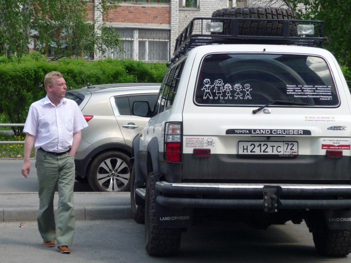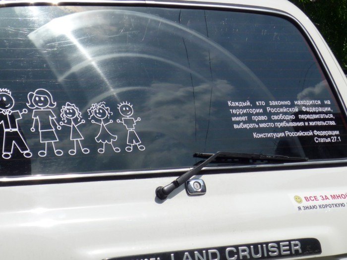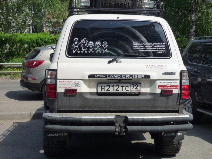 А в Тюмени есть джип с вот такими веселыми наклейками.