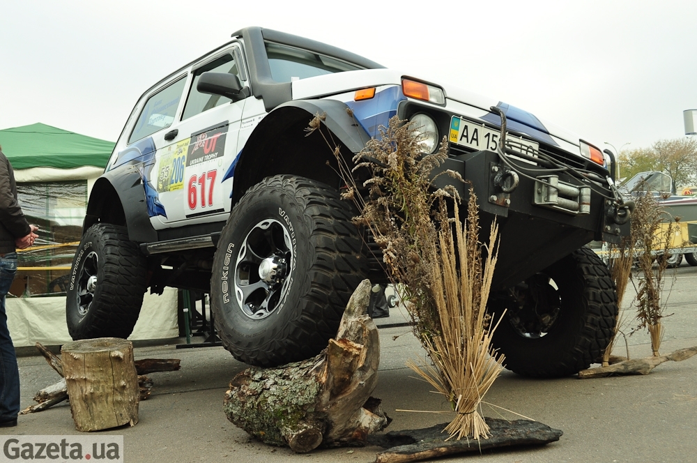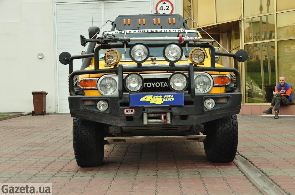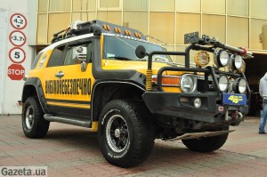 Перед входом в главный павильон стоит желтый вездеход Toyota с надписью на дверях «Огнеопасно». На номерах вместо набора цифр и букв надпись «ПОЯРКОВ».