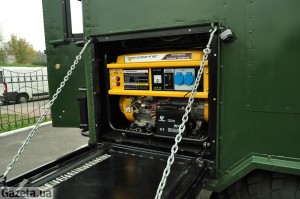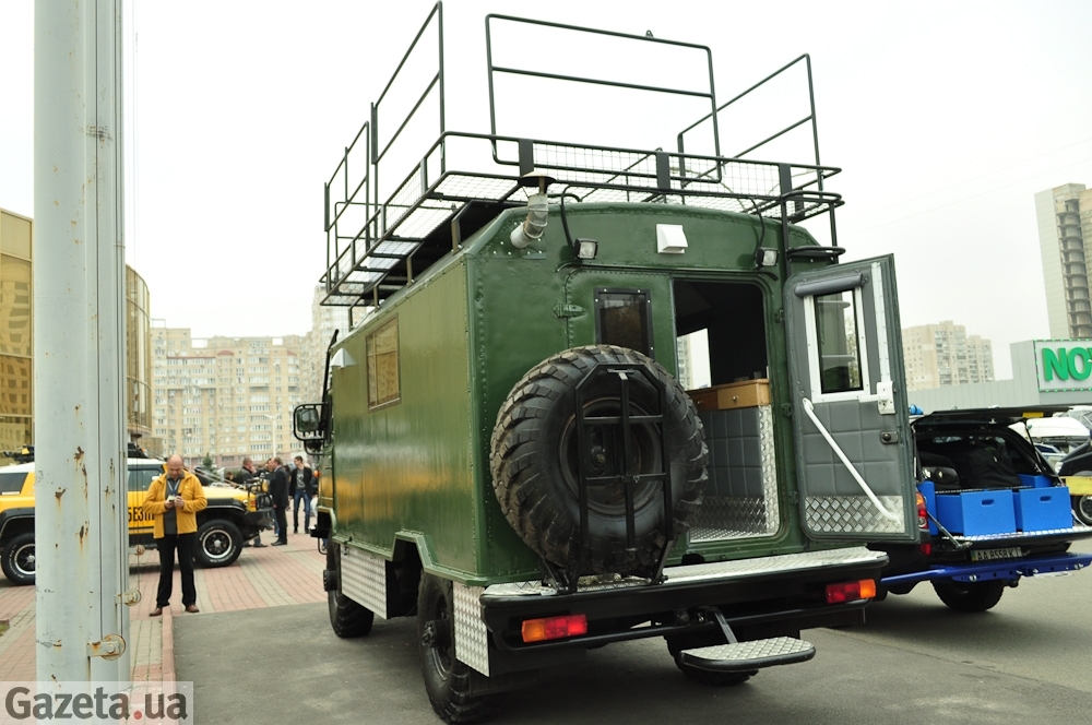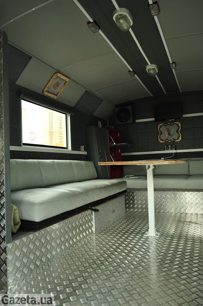 Автомобиль переоборудовали из военного в охотничий. Дно кунга обтянули рифленым алюминием. Поставили там стол, диваны и небольшой шкаф. Машина оборудована лебедкой и генератором.